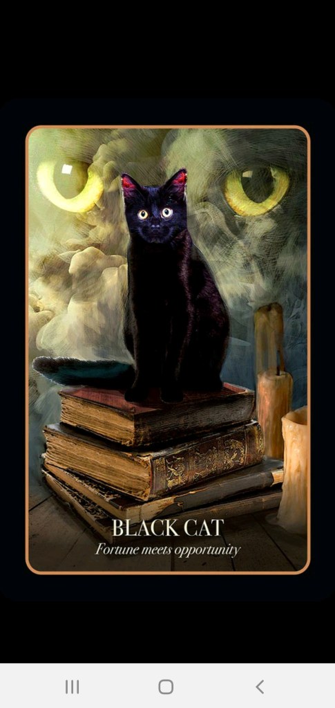Today’s message is from the Halloween Oracle by Stacey Demarco. Black Cat. Fortune meets opportunity. Wow, do I miss my girl. If you are grieving a pet on the other side, he or she would like to say hello to you now. Your pet is with God; but Heaven will not be complete until you, too, cross the Rainbow Bridge. Honor the memory of your pet by remembering the good times the two of you had together, donating your time and money to causes that help animals, and most of all by GETTING ANOTHER PET! 🙂 This sweet little soul is not lost forever. You are going to Heaven someday and he or she will meet you at the gates. Just a pause between hellos.