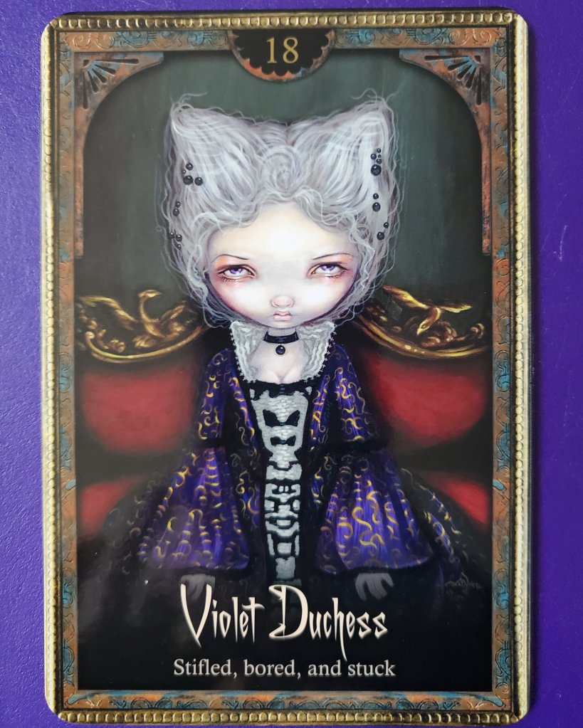 Today’s message is from the Oracle of Shadows & Light by Lucy Cavendish, illustrated by Jasmine Beckett-Griffth. The Violet Duchess. You are feeling buttoned down, caged in, and fed up right now and you are not going to take it much longer 🙂 It looks like you need a break. If you can, plan a few days away from work so you can take a roadtrip and spend some time in nature. A good friend who shares your wanderlust and restlessness might want to along with you. Travel to an unknown place, even if it is just a day trip to another part of the state. The change of scenery will spark fresh ideas and help you put any present challenges in perspective. When you get home, your illuminated windows and cozy four walls will be a haven again, not a prison. Shaking things up now will blow the cobwebs out of your head and help you to obtain clarity about your next steps along your life path. It is time to cut loose 🙂