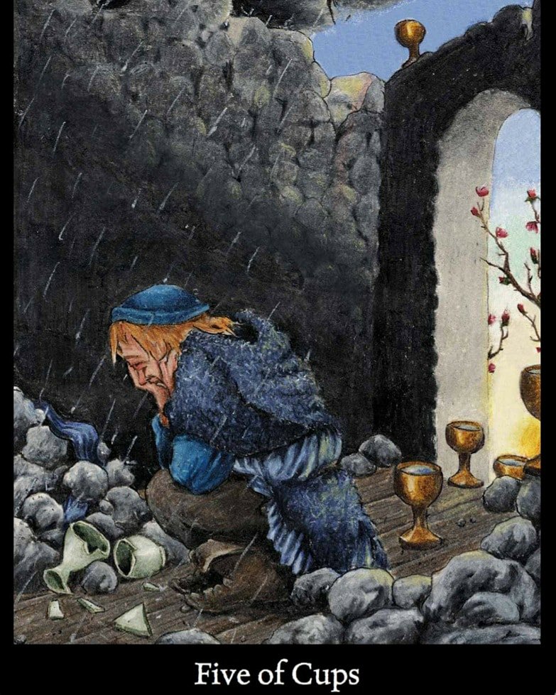 Today’s message is from the Anna K. Tarot. The Five of Cups. Wow, beat yourself up much? This card indicates regret, sorrow, and a sense of loss. You may be blaming yourself because you think you have missed an opportunity or let things slide. It’s going to be all right. Whatever you think you have lost probably wasn’t right for you anyway. That doesn’t mean that your feelings are not valid or that your regrets don’t hurt. Have a good cry and talk everything over with God, then resolve to stop punishing yourself. If you are stewing about a broken relationship and if there might be anything you can do to patch things up, make the call. Send the message. Be the bigger person. Then let it be and give it to God. The 2 cups still standing indicate that all is not lost. When you are ready, your life is going to start moving forward again. New chances and fresh vistas are calling. Have a great day 🙂