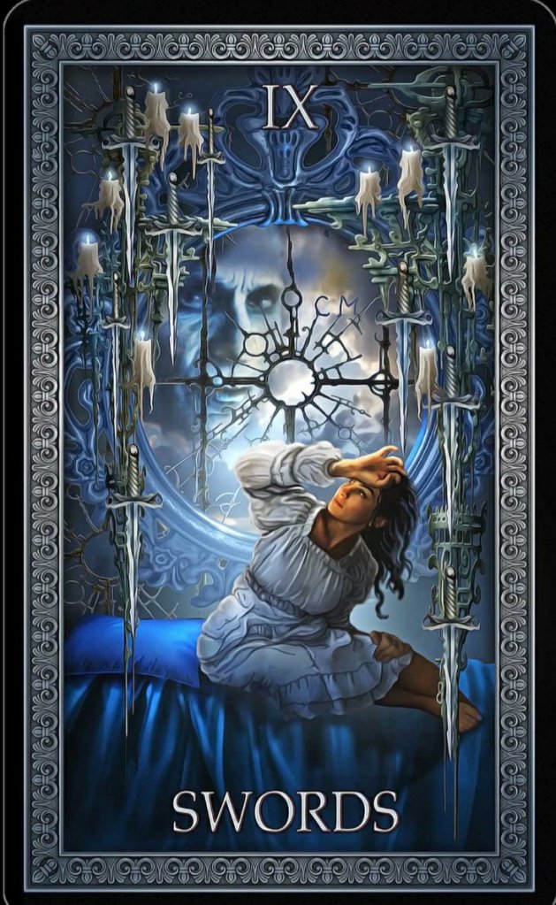 Today’s message is from the Tarot Grand Luxe by Ciro Marchetti. The 9 of Swords. Unfounded fears. You might have woken up from a nightmare this morning. God knows I did. Nothing is more dull than someone else’s dream, so I won’t bore you with the details. Suffice it to say, I was very happy to find myself in my own bed.
