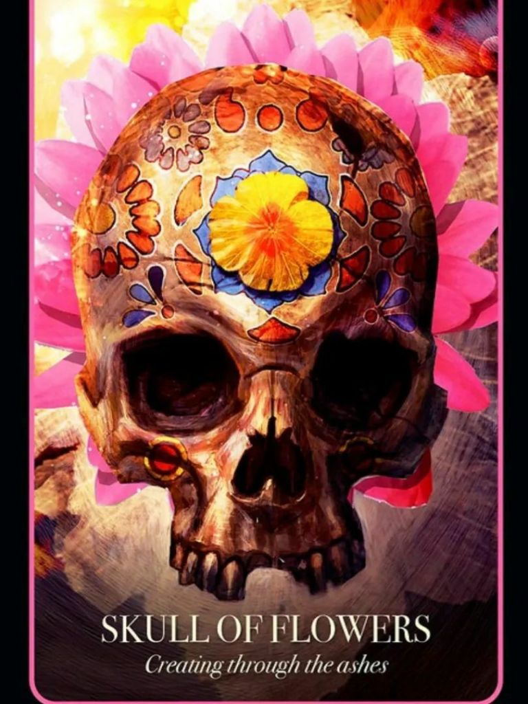 Today’s message is from the Halloween Oracle. Skull of Flowers. Creating through the ashes. Don’t be afraid to start over. Your plans might be falling apart but you are still on track. God has a plan for your life, and you participated in creating this. The blueprint for your life lies within you. Sometimes it’s necessary for old ways to be torn down before a fresh path opens up . Sit back and take stock of all the things you have going for you: it might be a loving relationship, rugged health, or great friends. Keep the faith. Right now the outer trappings might look chaotic but this is the beginning of a new order in your world. Stay grounded and remember who you are, a perfect child of God. Everything else can be fixed. Over the next six months you are going to see a new, better life grow up around you. God bless you and have a great day –